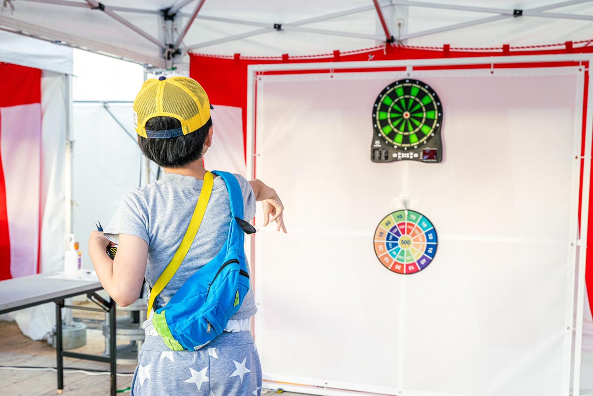 5本投げて、中央(BULL)に当たれば200円食事券またはおもちゃをプレゼント!